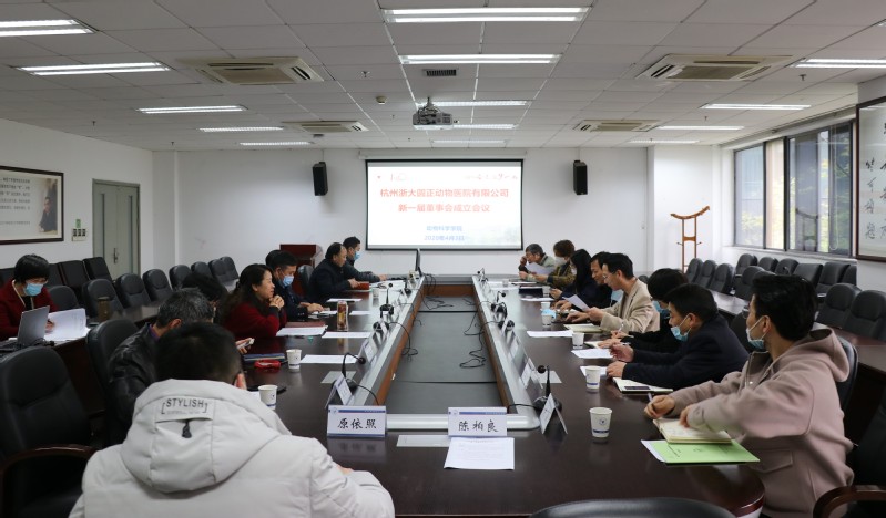 2020年4月3日下午,在动物科学学院E250会议室,动物科学学院会同浙江大学控股集团有限公司召开杭州浙大圆正动物医院新一届董事会成立会议。校科学技术研究院、经营性资产办公室、浙江大学控股集团有限公司、动物科学学院、动物医院等相关部门单位负责人及其选派的董事和监事等共15人参加会议。会议由浙江大学控股集团有限公司楼润正副总裁主持。