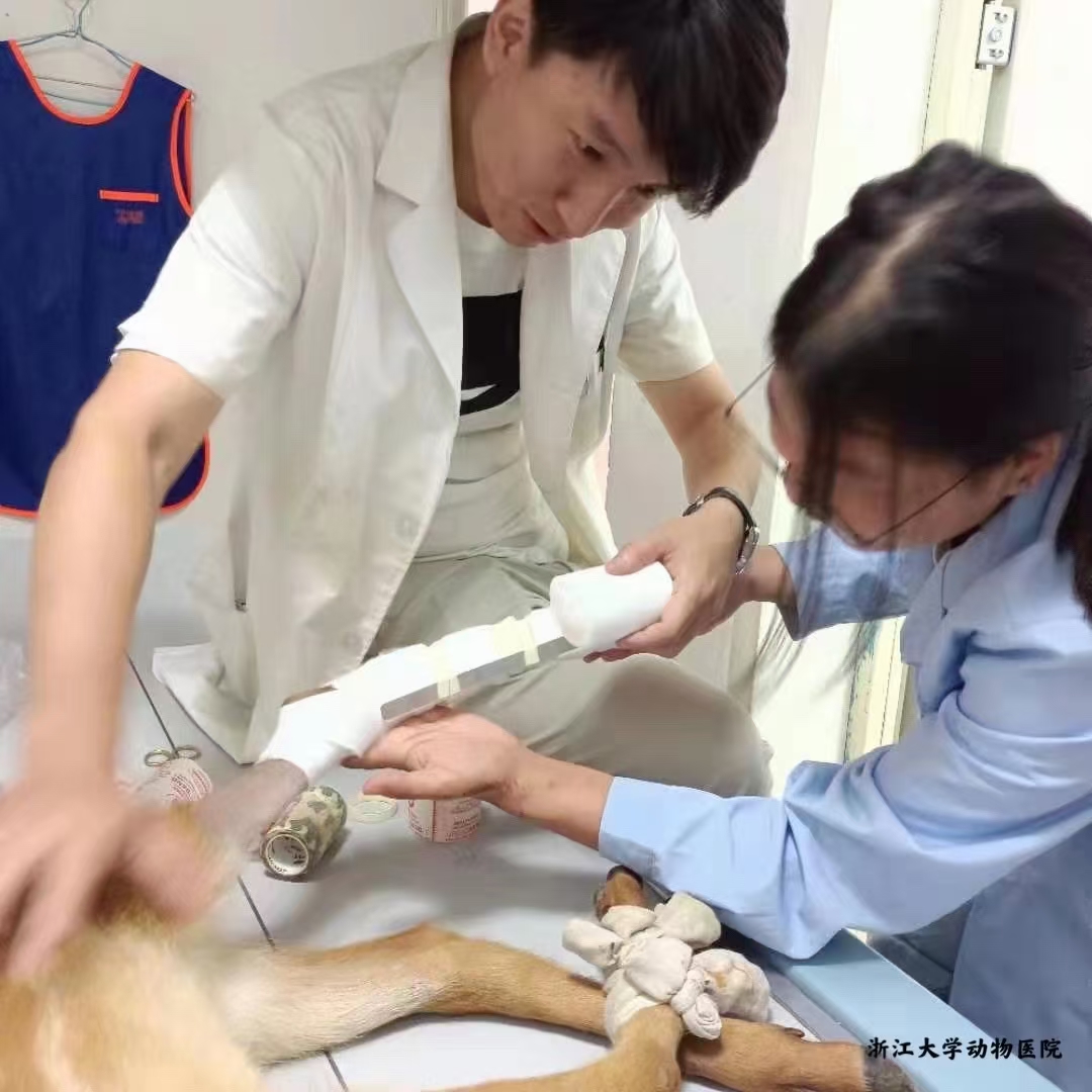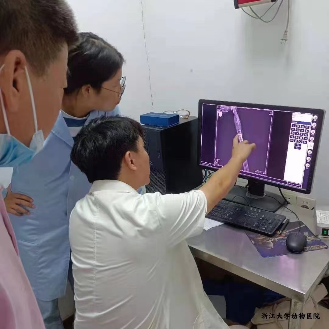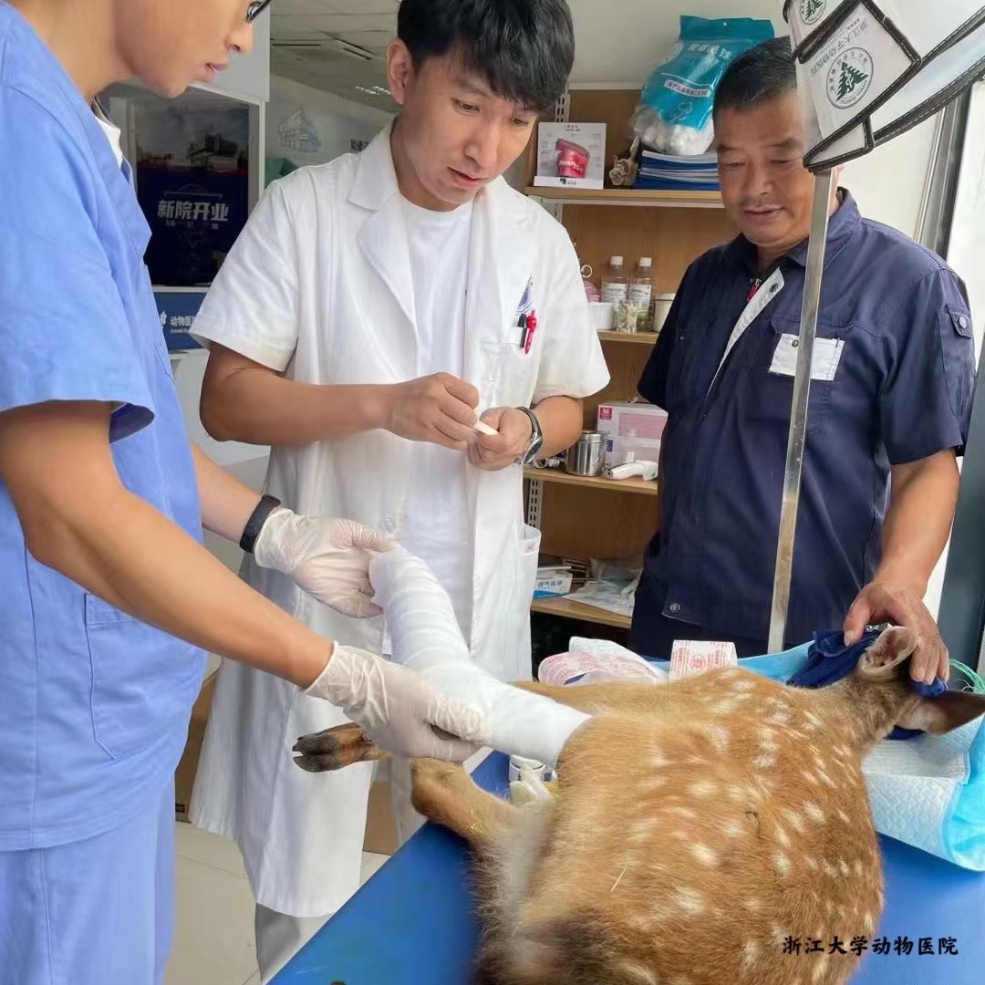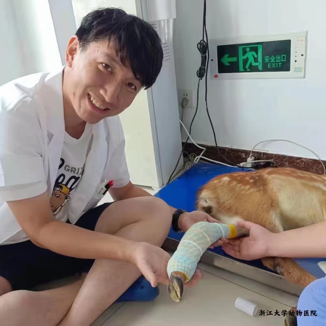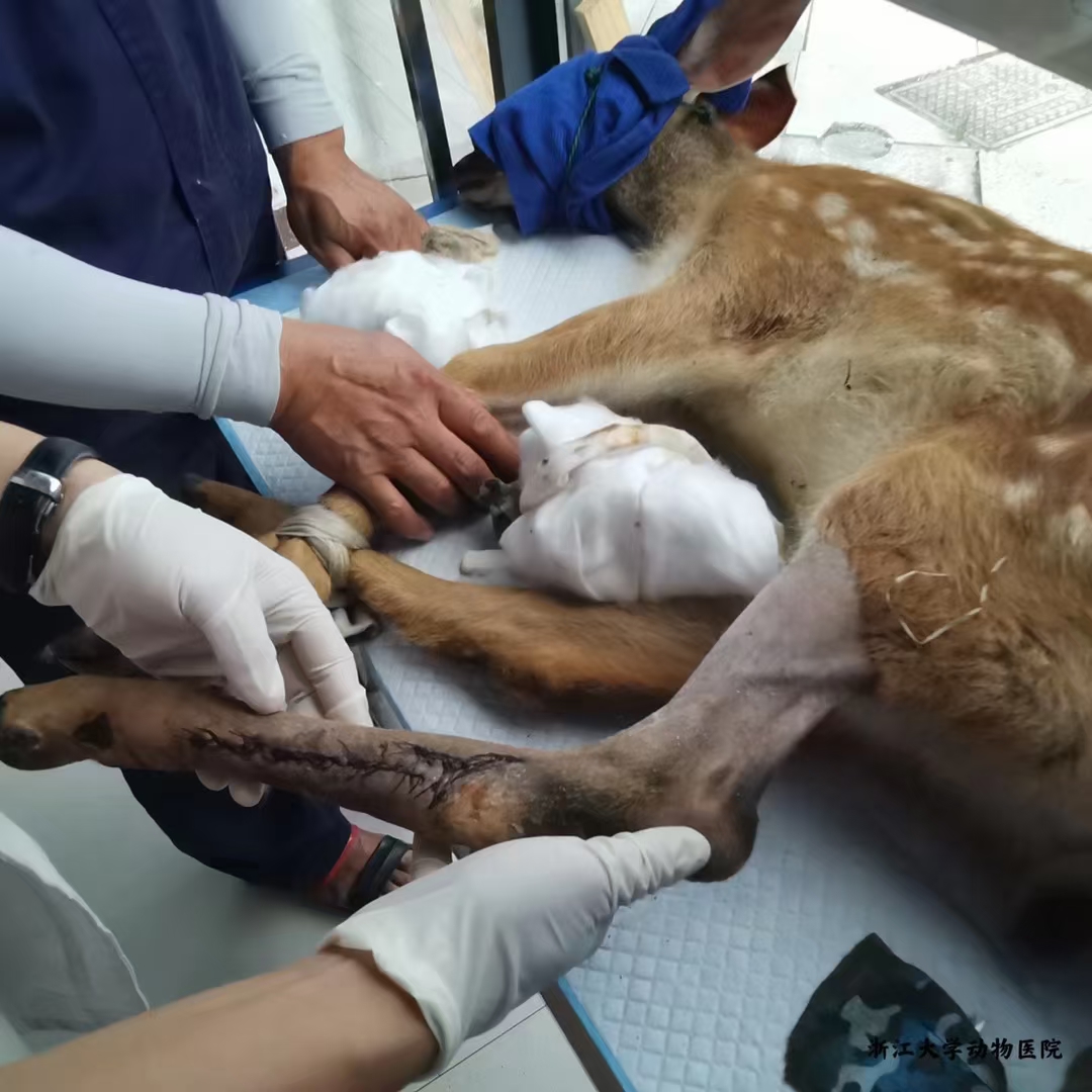 7月22日,两个月大的梅花鹿“呦呦”来到我院,询问得知呦呦个性活泼调皮,不小心摔伤了腿。经过X光检查发现呦呦骨折了。董振华大夫决定对呦呦进行外固定。7月23日,进行了手术。董振华大夫为呦呦受伤的腿上了钢板,还套上了像裤子一样的腿套,起到稳固、保护的作用。目前“呦呦”被隔离在单独的鹿舍养伤,在良渚古城遗址公园的工作人员的精心照顾下,伙食也得到了提升,不仅有新鲜草料,还有玉米粒、豆粃等饲料增强抗病力,看他大嚼特嚼的欢脱样,恢复指日可待。